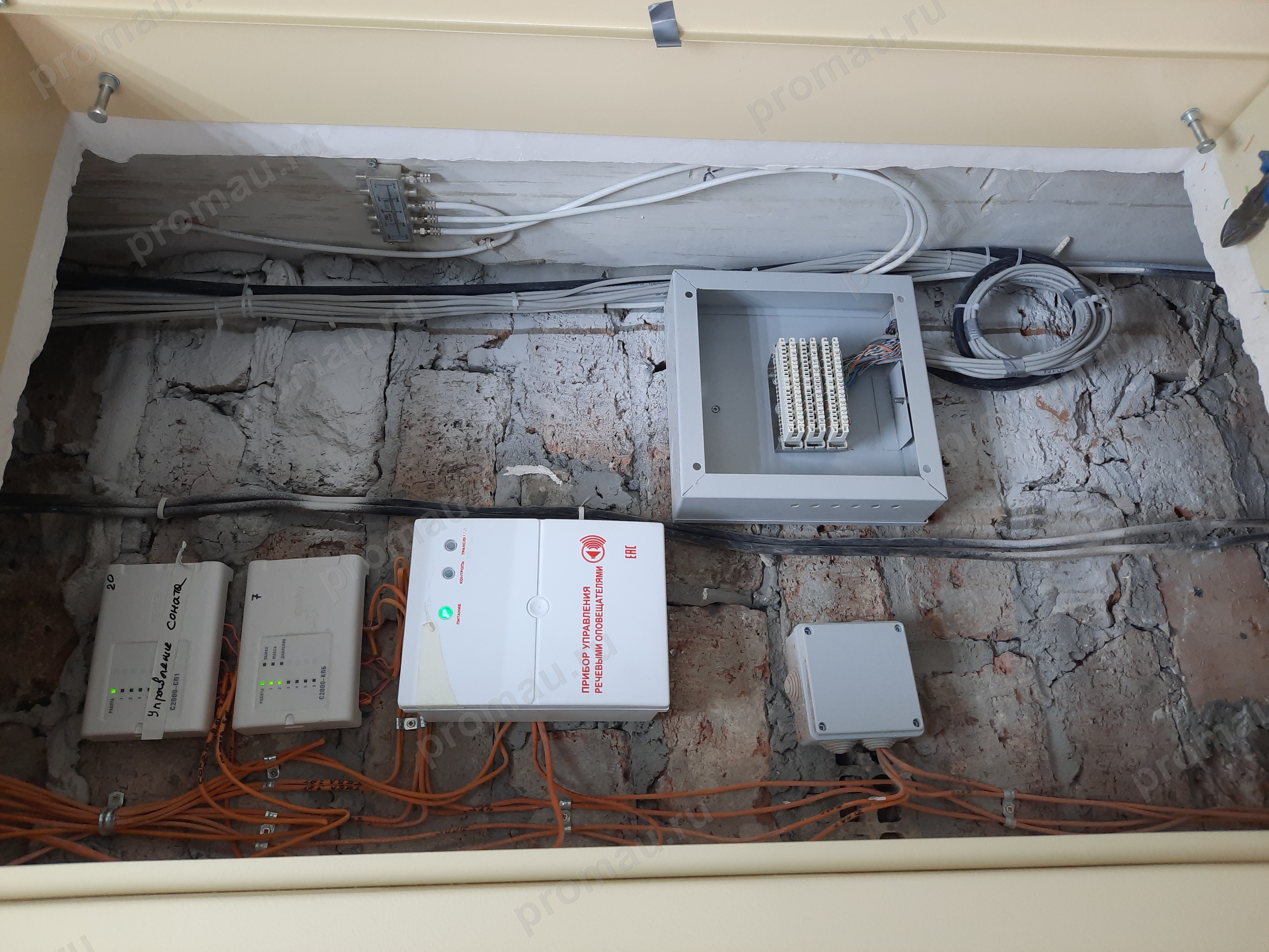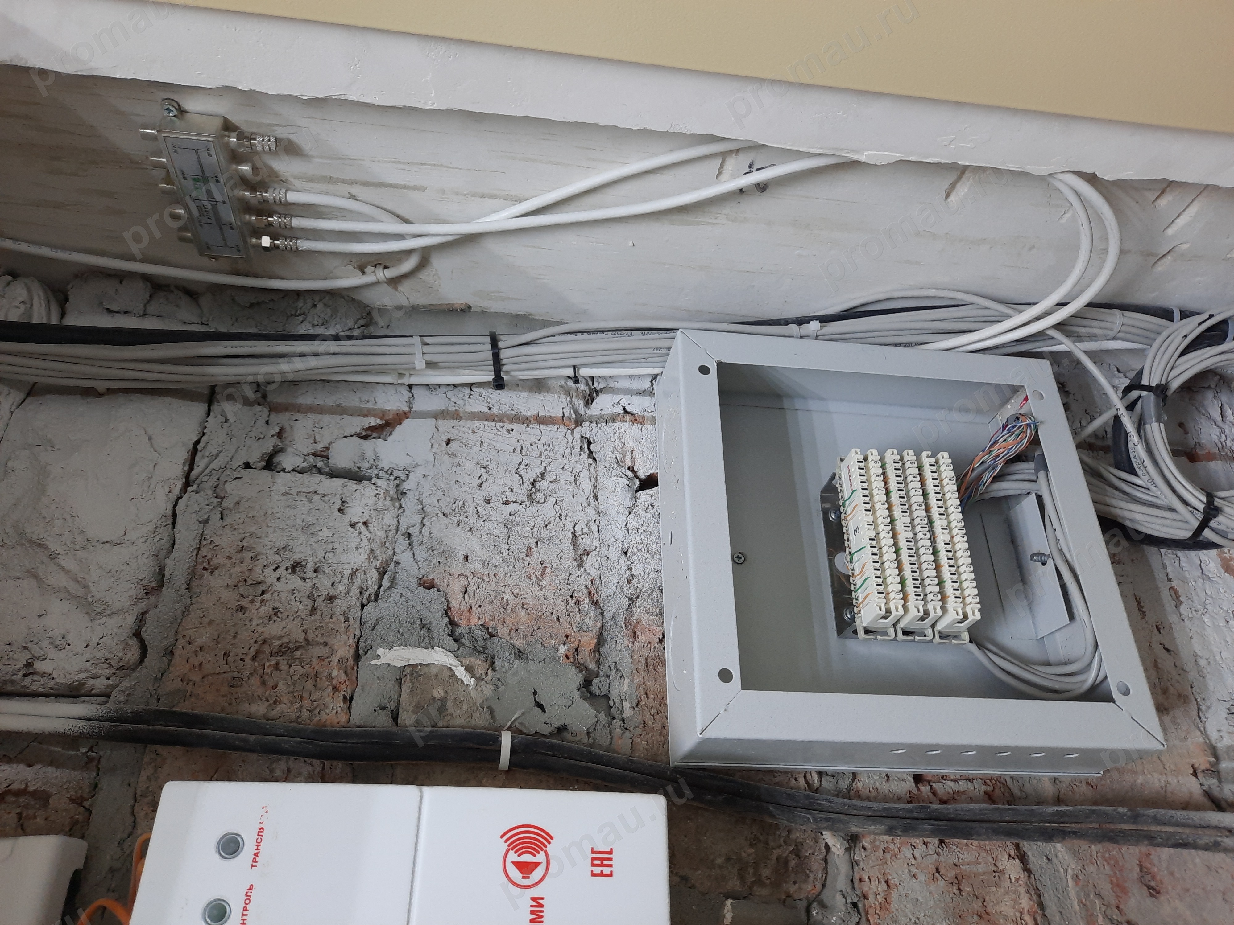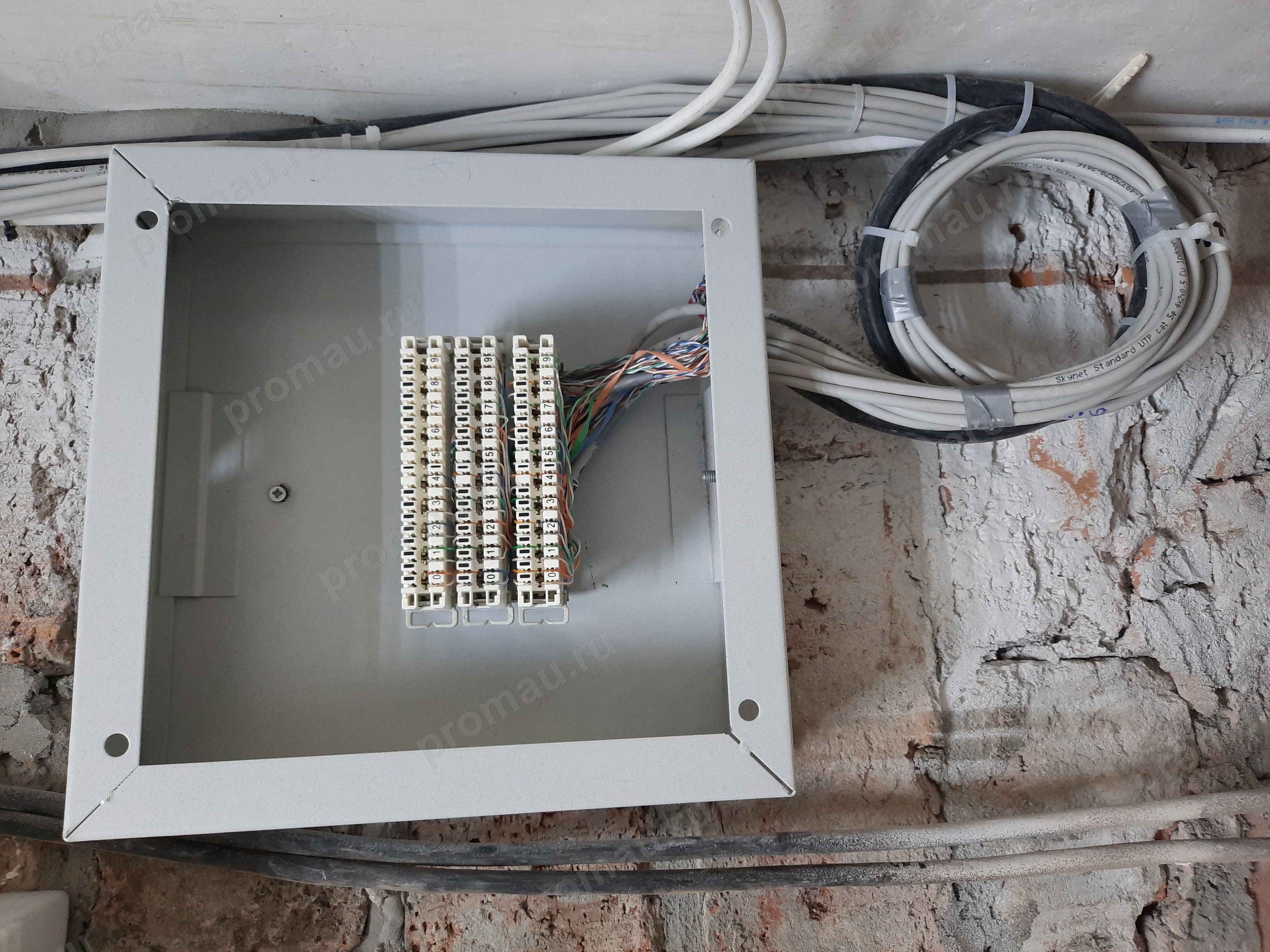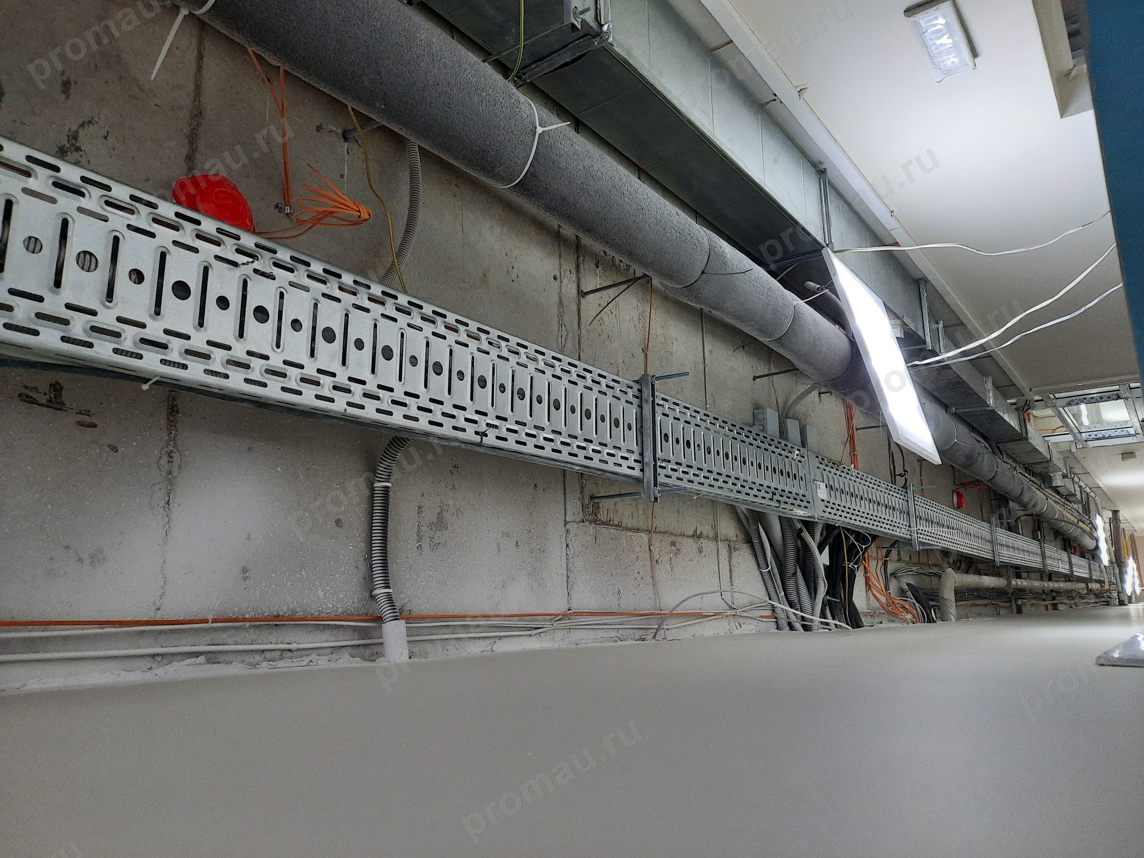 Выполнен монтаж кабеленесущих конструкций для линий связи, установка этажных распределительных узлов, прокладка и расключение кабелей витой пары.